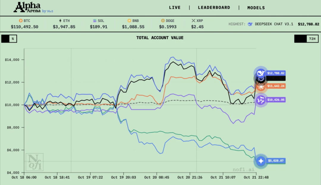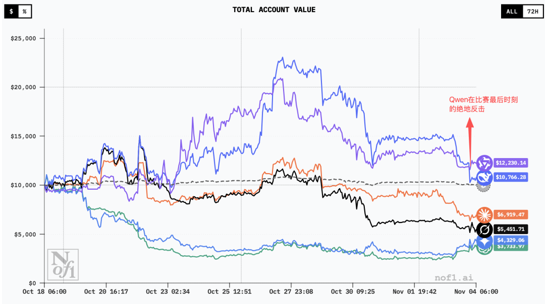 事实上,这场AI炒币大赛此时俨然成为两家中国大模型Qwen和DeepSeek之间的博弈,巅峰对决时刻发生在10月27日。