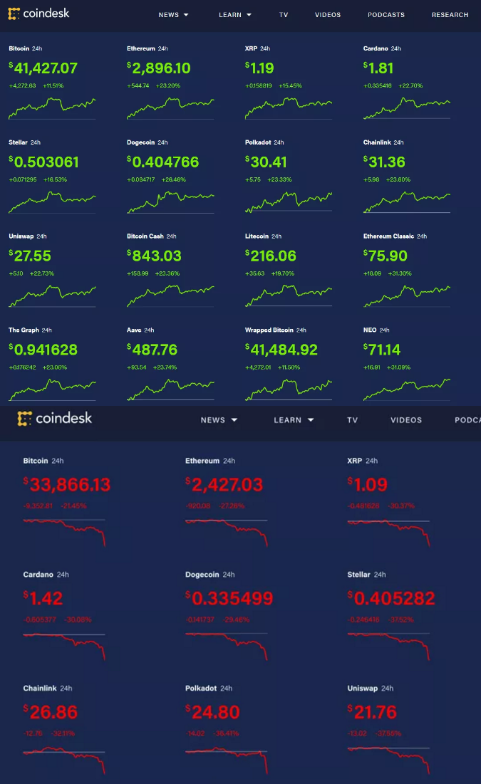 ▲上图:5月20日“币圈”实时价格;下图:5月19日“币圈”实时价格。图片来源:coindesk