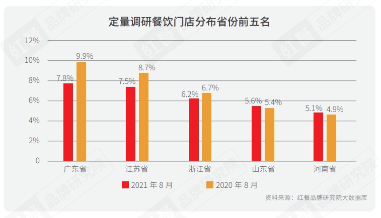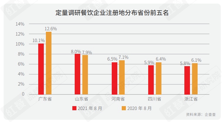 除了餐饮门店的分布,餐饮企业的分布也体现了在省份维度上“去中心化”的情况,并且在企查查的餐饮企业地域分布统计中得到了印证。根据企查查的数据,2020年8月,餐饮企业注册省份分布比例前五名为广东、山东、浙江、江苏和河南,前五名的集中度为40.2%。而2021年8月餐饮企业注册省份分布比例前五名为广东、山东、河南、四川和浙江,前五名的集中度为36.3%,同比下降了3.9个百分点。
