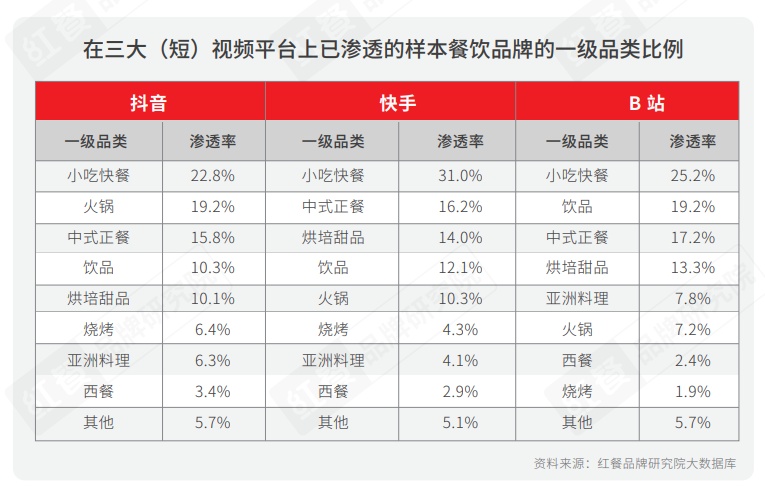 此外,三大平台上不同餐饮品类的渗透率也不尽相同。相同的是,小吃快餐和中式正餐在三个平台的渗透率都非常高,是通吃三大平台的高渗透、高曝光品类。不同的是,三个平台都有各自的、独特的高渗透品类,抖音、快手和B站分别对应火锅、烘焙甜品和饮品。
