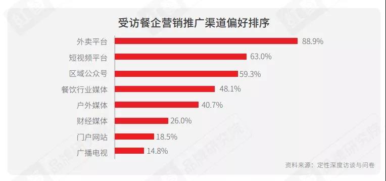 外卖平台依然是受访餐企的首选营销渠道,并且比例遥遥领先。值得一提的是,短视频平台的偏好比例已经超过区域自媒体,成为受访餐企排名第二的营销推广渠道,后文会对主要短视频平台进行专门解读。此外,户外媒体的偏好比例也很亮眼,很多餐饮品牌选择楼宇媒体、地铁广告、户外招牌等渠道作为品牌曝光的主要渠道,也取得了非常好的营销效果,例如西贝莜面村和农耕记,都是典型的杰出代表。