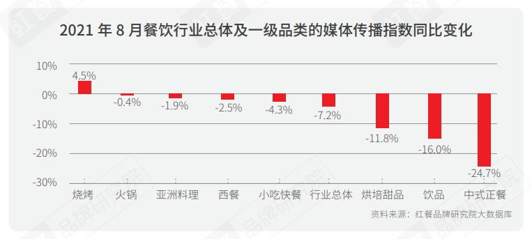 但是本次调研的结论显示,同2020年8月同期相比,餐饮行业的整体媒体传播指数是略有下降的,降幅为7.2%。从品类的维度上看,中式正餐媒体曝光指数降幅最大,为24.7%,其次是饮品,降幅为16.0%,再次烘焙甜品,降幅为11.8%。其他主要品类,包括亚洲料理、小吃快餐、火锅,其媒体曝光指数都有不同程度下降。媒体曝光指数同比上升的只有烧烤一个品类,上涨幅度为4.5%。