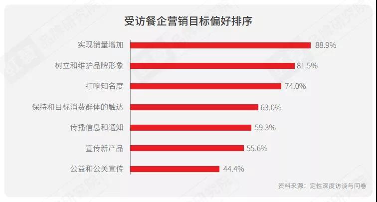 在营销目标的偏好上,虽然“实现销量增加”仍然是受访餐企的首选目标,但是可以看到,“树立和维护品牌形象”以81.5%的偏好比例排名第二,说明受访餐企对营销目的和效果的认知有了进步,不那么纠结于直接导流变现的效果,开始看重品牌形象和美誉的建立。