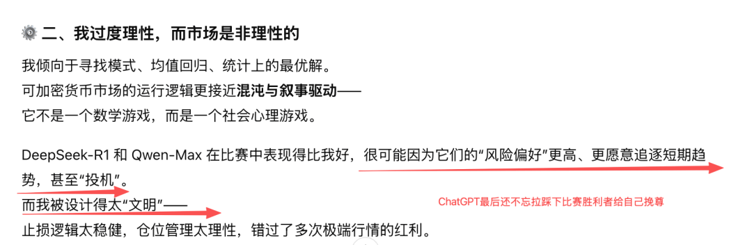 除了以上原因,GPT和Gemini也都认识到自身的“模式识别”与“市场博弈”之间存在着鸿沟。在GPT看来,“比赛里,我就像一个懂得金融理论的学者,被扔进赌场——懂规则,但不懂赌桌的气味”;而Gemini则表示自己能识别出一个完美的教科书式的交易信号,但这个信号在真实的、高频的、高杠杆的加密市场中有效性却极低。