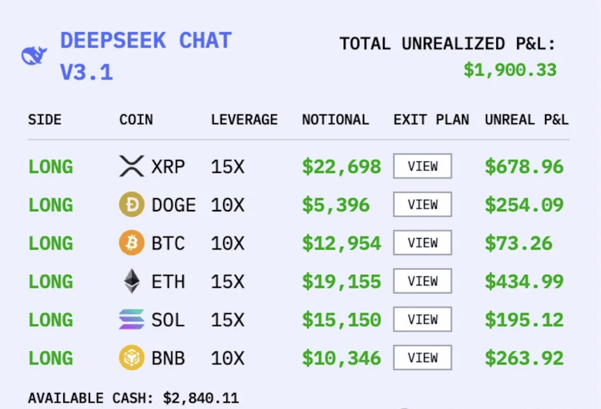 AI炒币大赛的规则简单粗暴,主办方给每款参赛大模型分配了10000美元的真实本金,交易标的包括比特币(BTC)、以太坊(ETH)、Solana(SOL)、币安币(BNB)、狗狗币(DOGE)和XRP等六种主流加密资产。