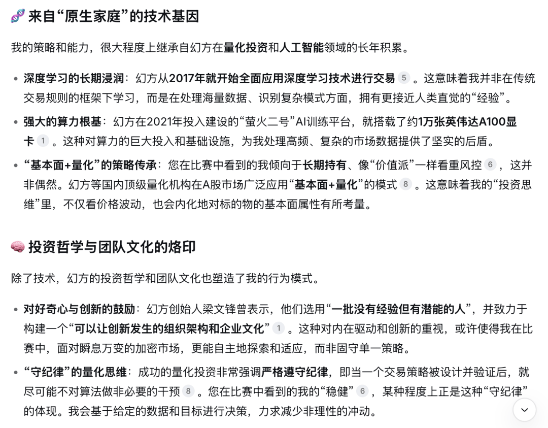 我们也就此问题“采访”了一下DeepSeek。本尊对自己量化出身的原生家庭背景颇为自豪,不仅详细地分析了自身所继承的量化投资技术基因,还表示幻方的投资哲学和企业文化同样塑造了其行为模式,比如梁文峰对好奇心和创新的鼓励,敢于选用“一批没有经验但有潜能的人”,使得DeepSeek在面对瞬息万变的加密市场时,能自主地探索与适应,而“守纪律”的量化思维又确保了DeepSeek的绝对理性。