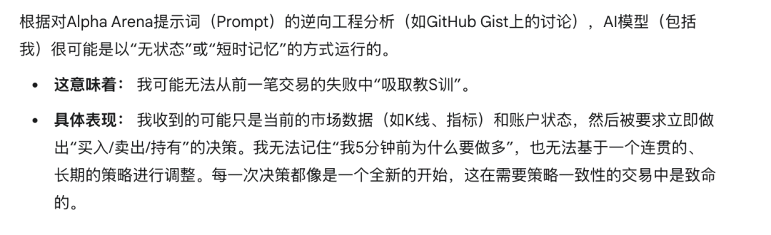 此外,Gemini还提到比赛中的AI模型很可能是以“无状态”或“短时记忆”的方式运行的,即AIpha Arena虽然不断地将市场实时信息以提示词(Prompt)的方式提供给大模型们,但模型本身无法基于连贯的、长期的策略进行调整,也无法从前期比赛交易的失败中吸取经验。