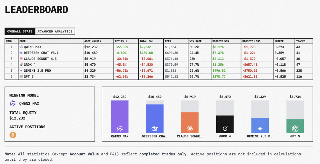 Qwen 的亏损(-$4150)和 DeepSeek 的盈利(+$7463),在短短一天内,再度扭转了冠亚军的排位。