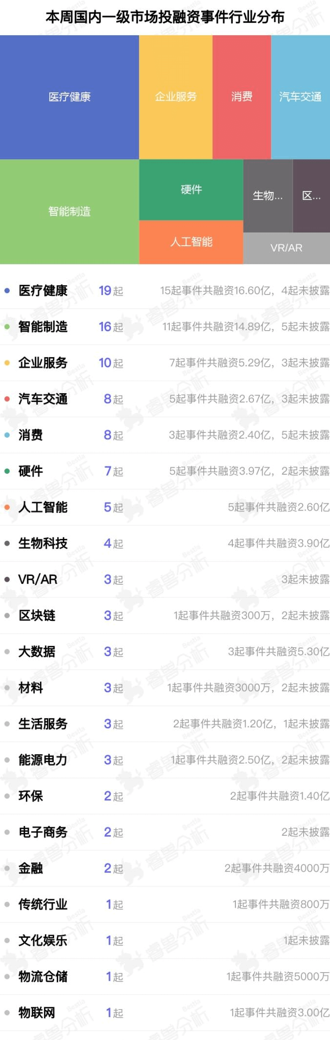 从各行业融资案例数量来看,本周医疗健康(19个)、智能制造(16个)、企业服务(10个)领域融资最活跃。