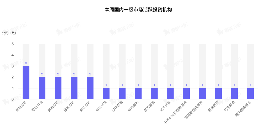 从机构投资活跃度来看,源码资本(3个投资事件)、软银中国(2个投资事件)、凯泰资本(2个投资事件)、线个投资事件)、毅达资本(2个投资事件)在本周创投市场中较为活跃。