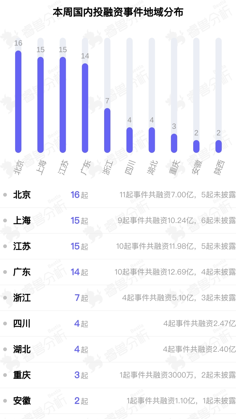 从本周披露获投企业的地域分布来看,主要集中在北京、上海、江苏。其中北京披露16个,上海披露15个,江苏披露15个。